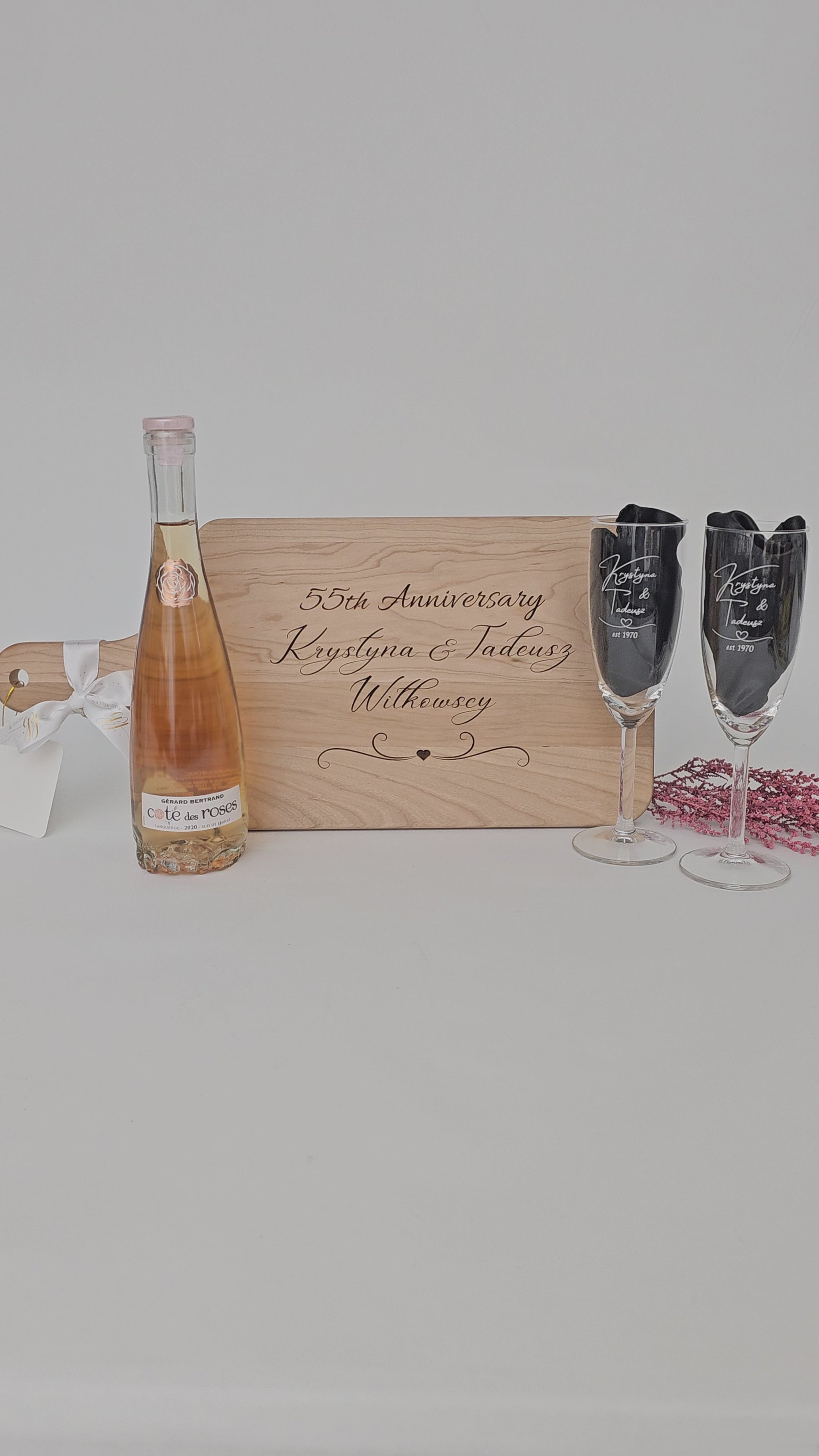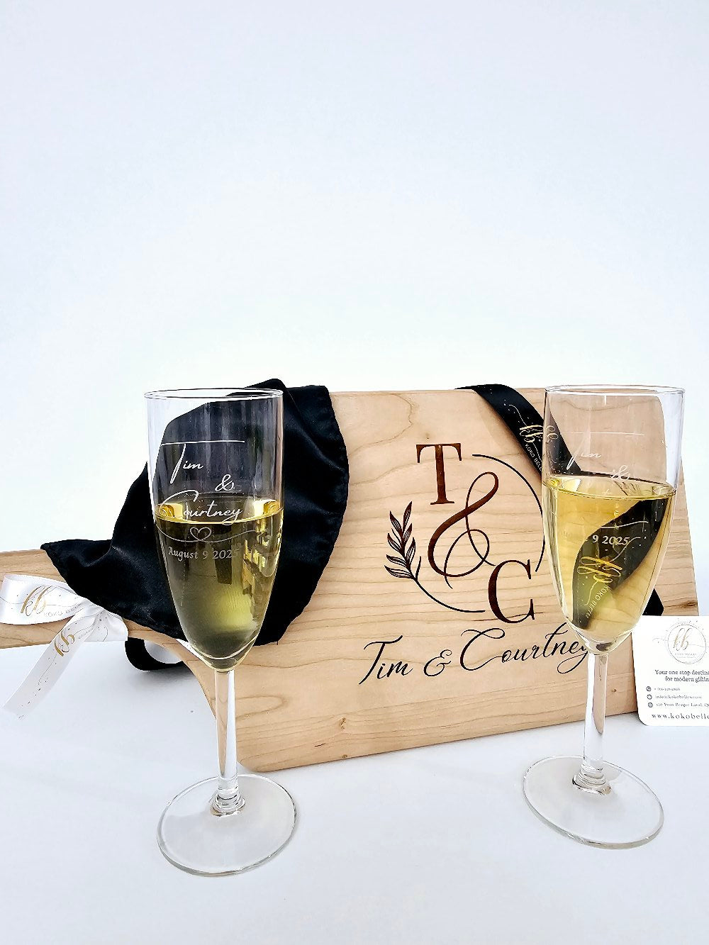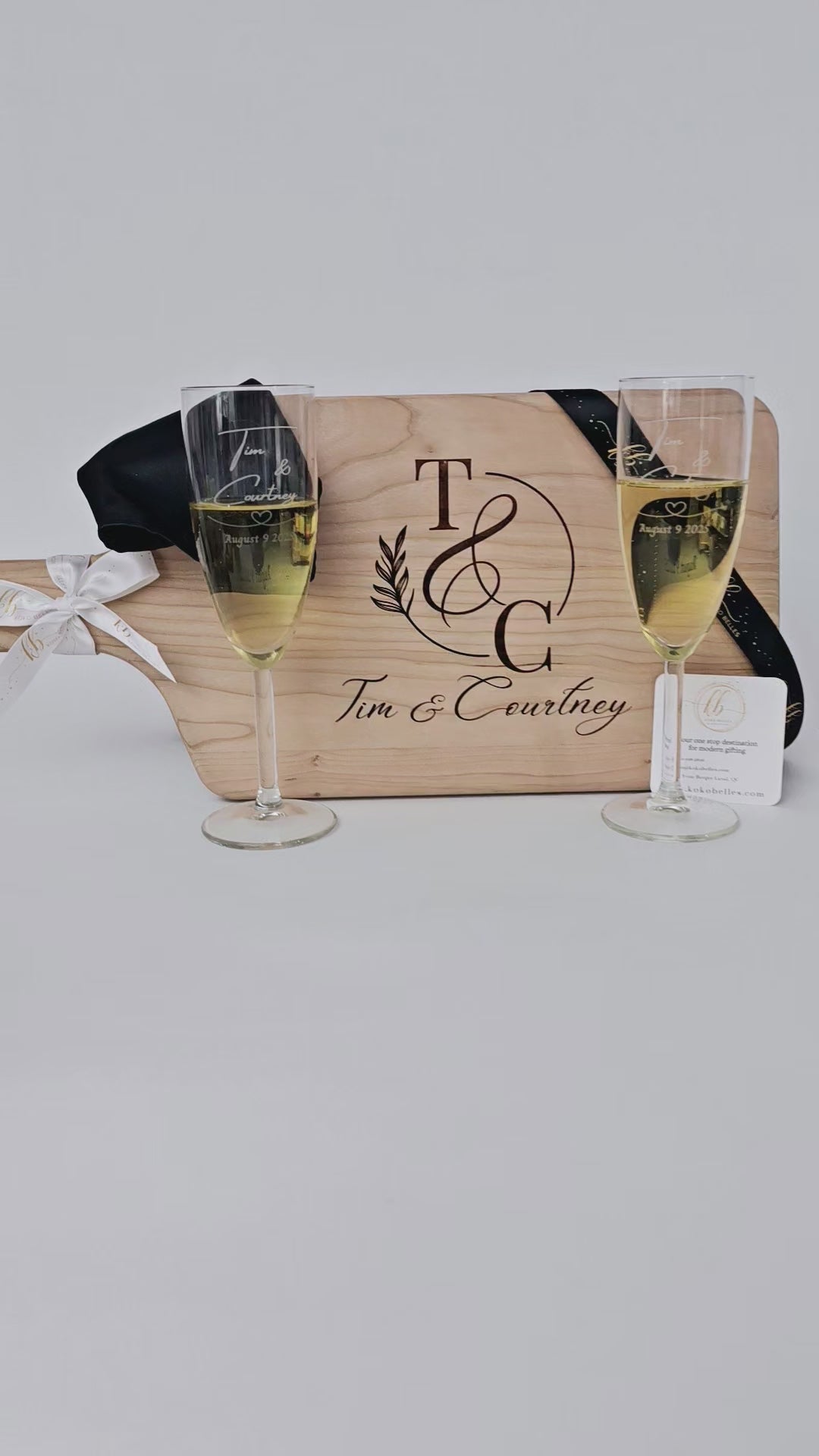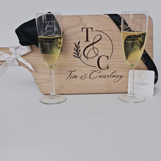 Toast to new beginnings with our exquisite personalized gift set, featuring a beautifully engraved cutting board and a pair of elegant champagne glasses.