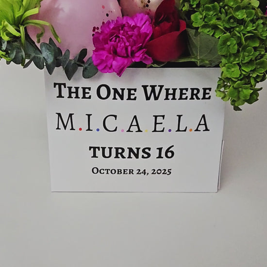 Mini Balloons: A mix of decorative mini balloons nestled among the flowers, adding color and flair to the base.
