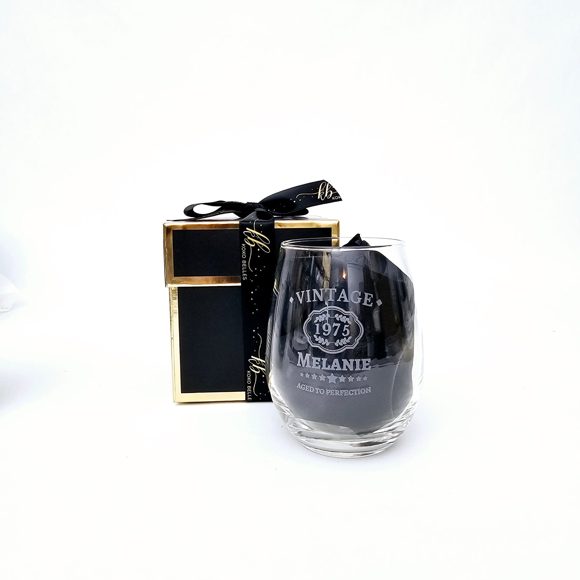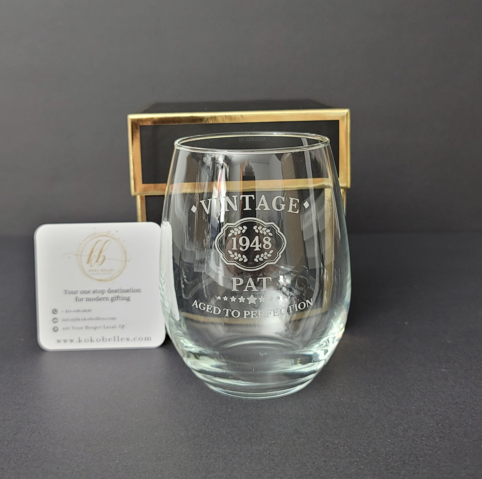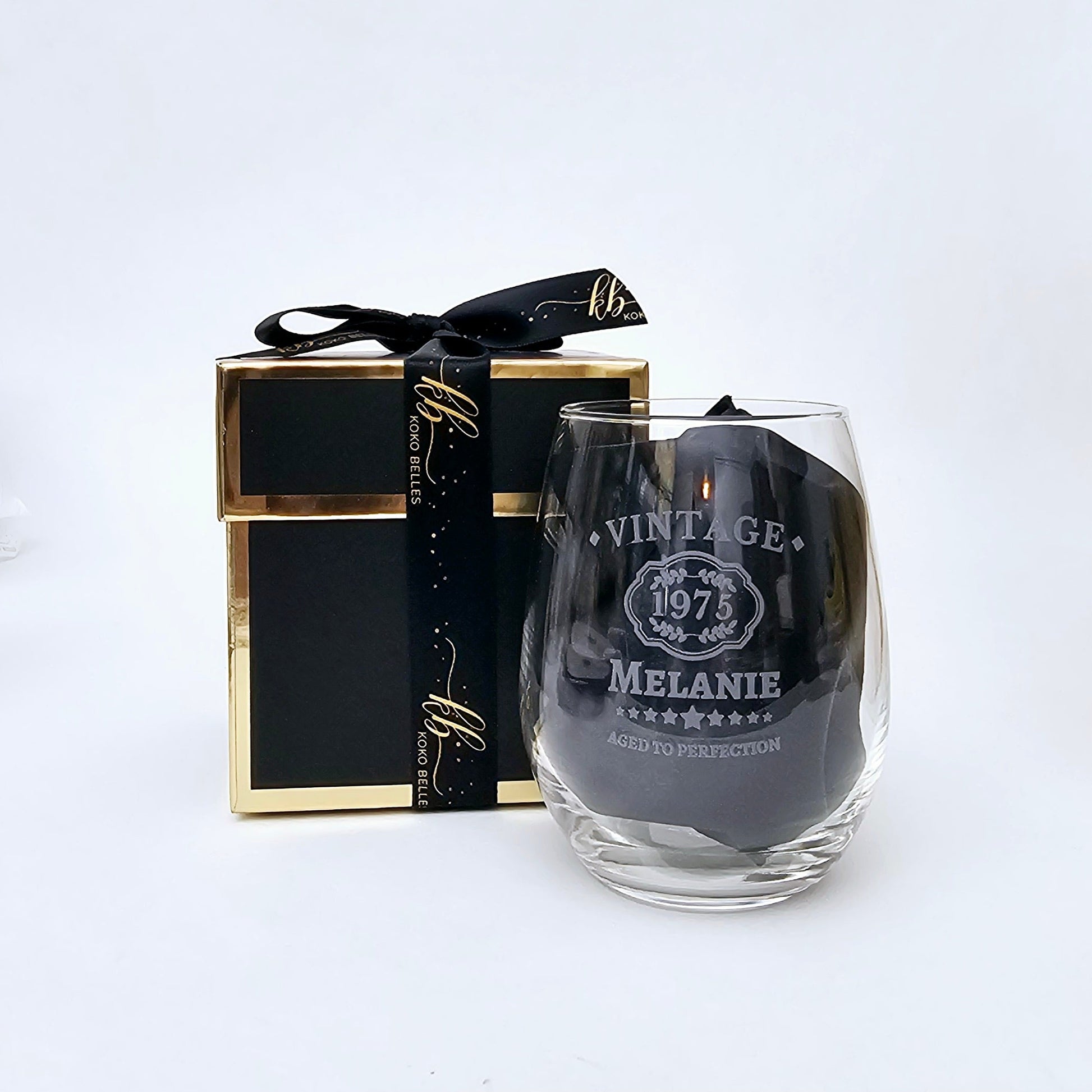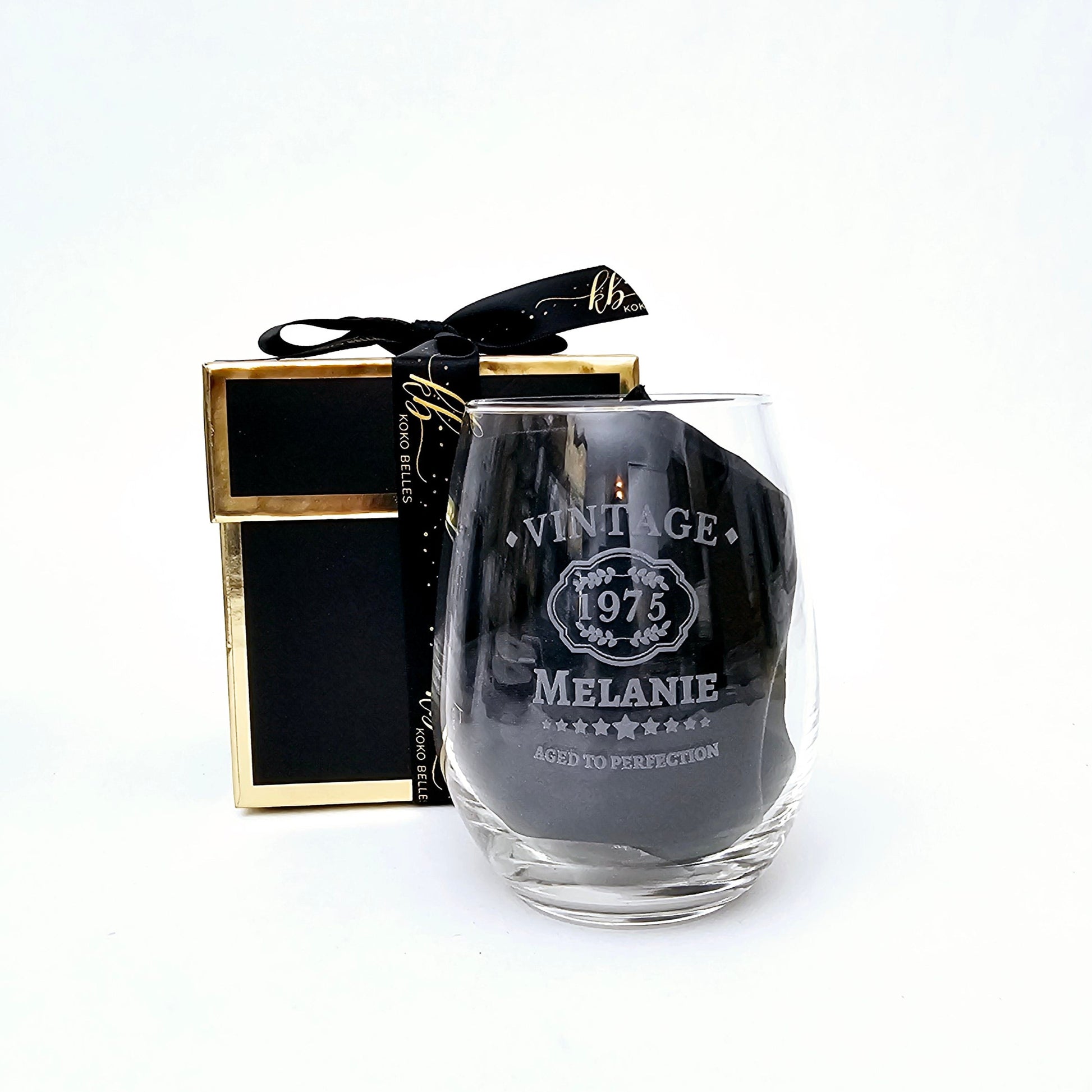 The perfect personalized gift for her! This stemless wine glass can be custom engraved with a name and year, featuring an "Aged to Perfection" design. Ideal for birthdays, Mother's Day, Christmas, and more.