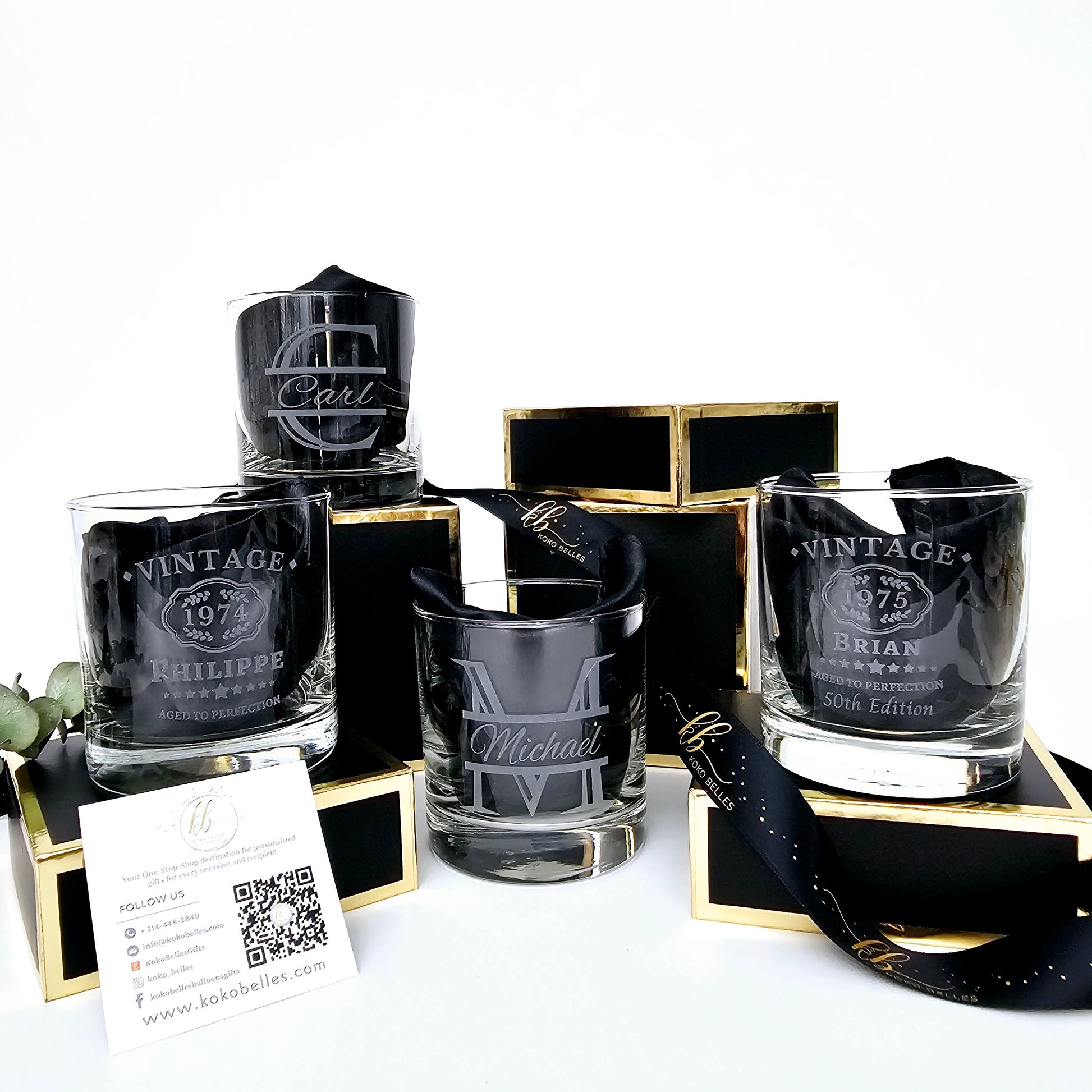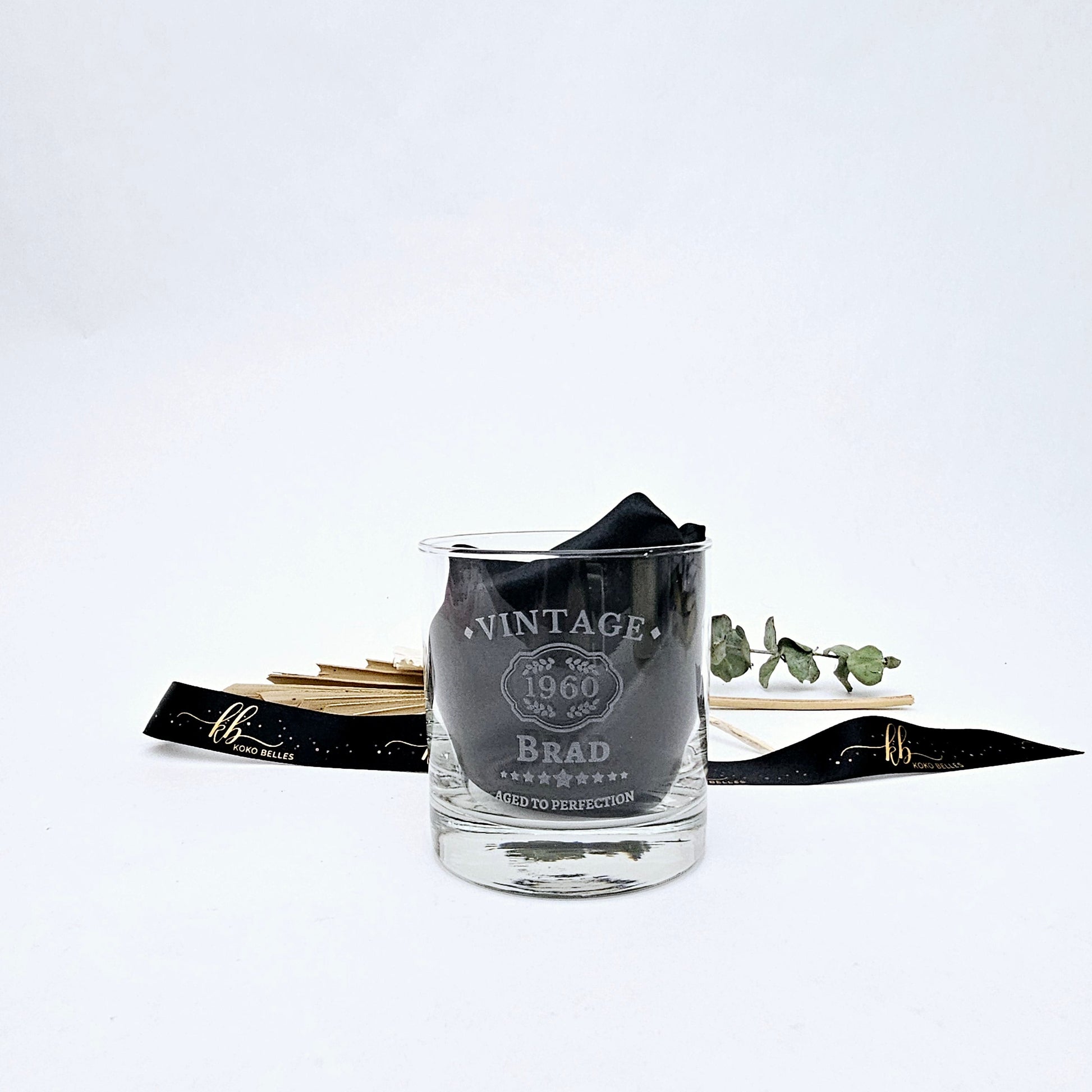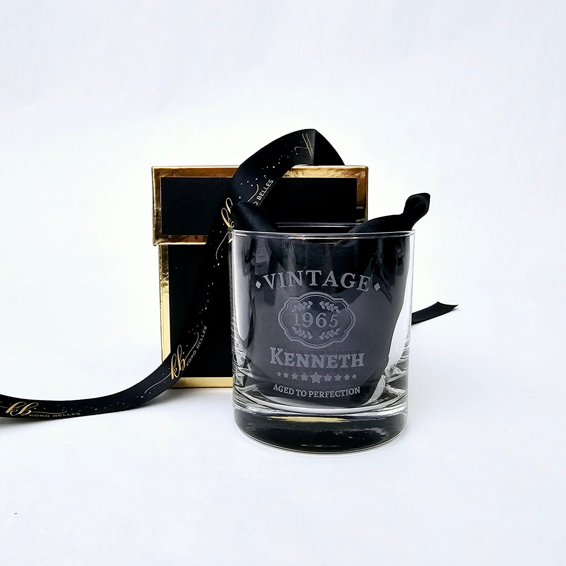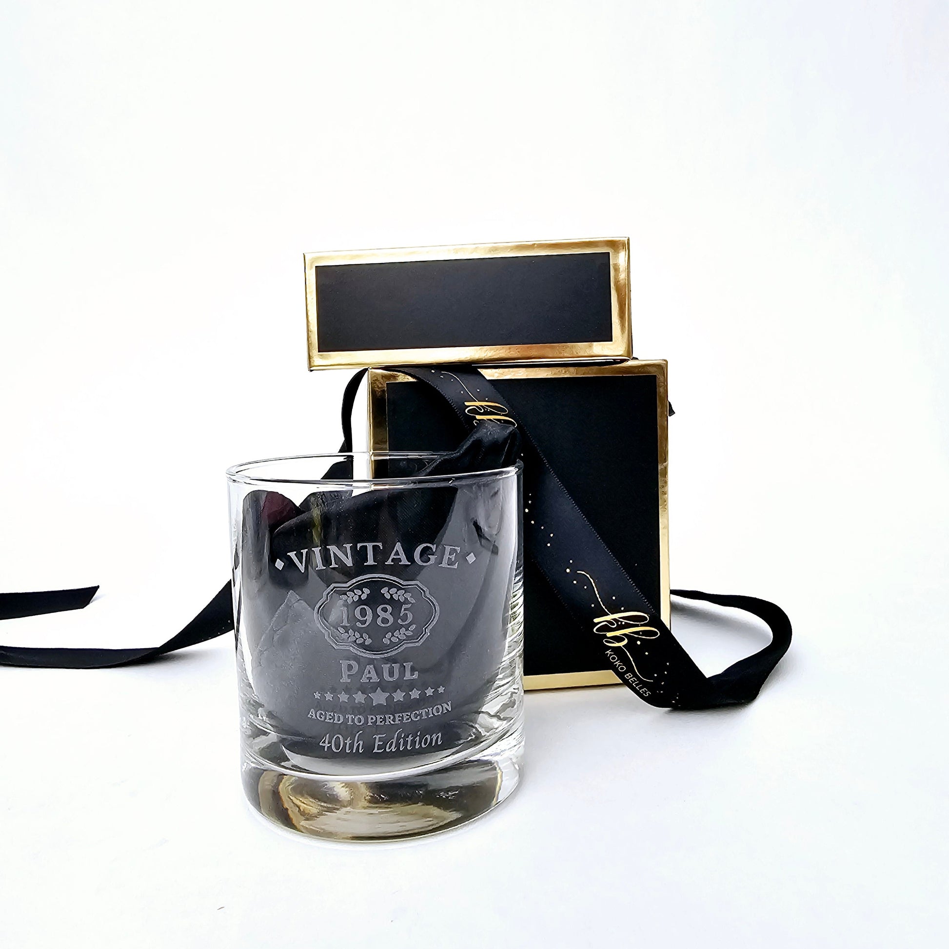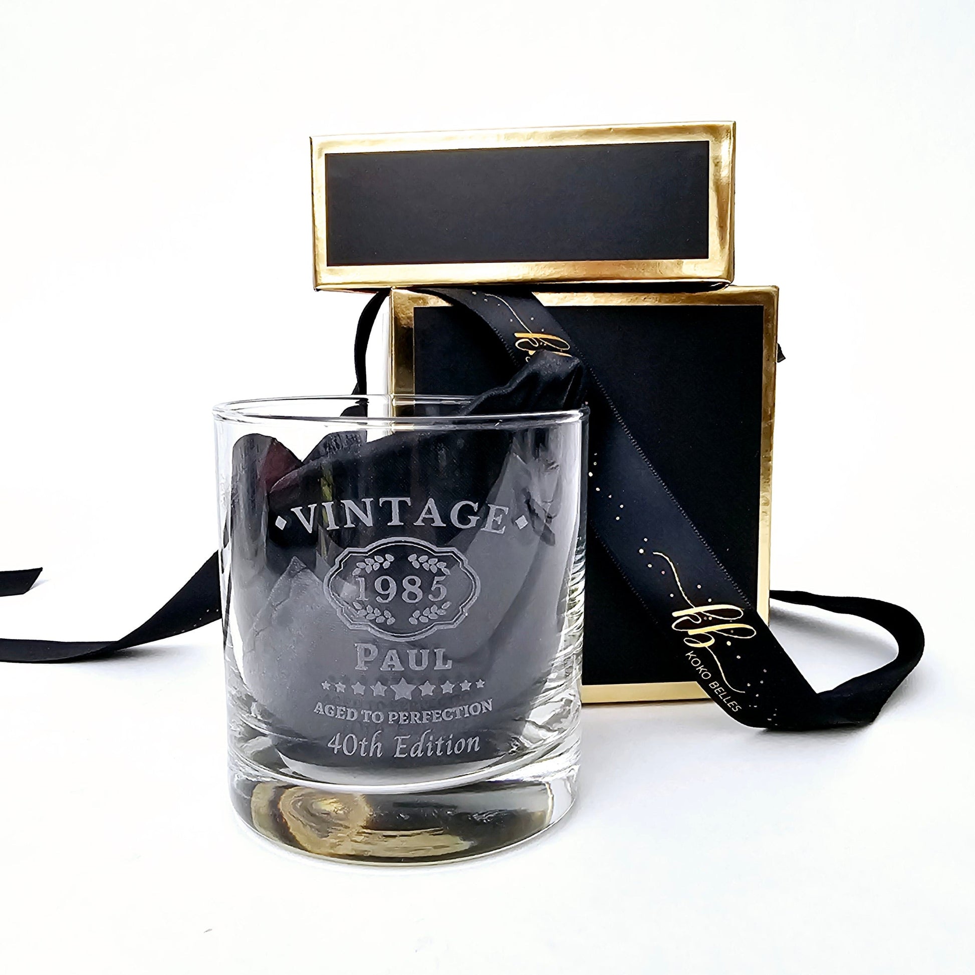 Unique personalized laser engraved whiskey glass. Vintage "Limited Edition" style, ideal "aged to perfection" gift for him on his milestone birthday.