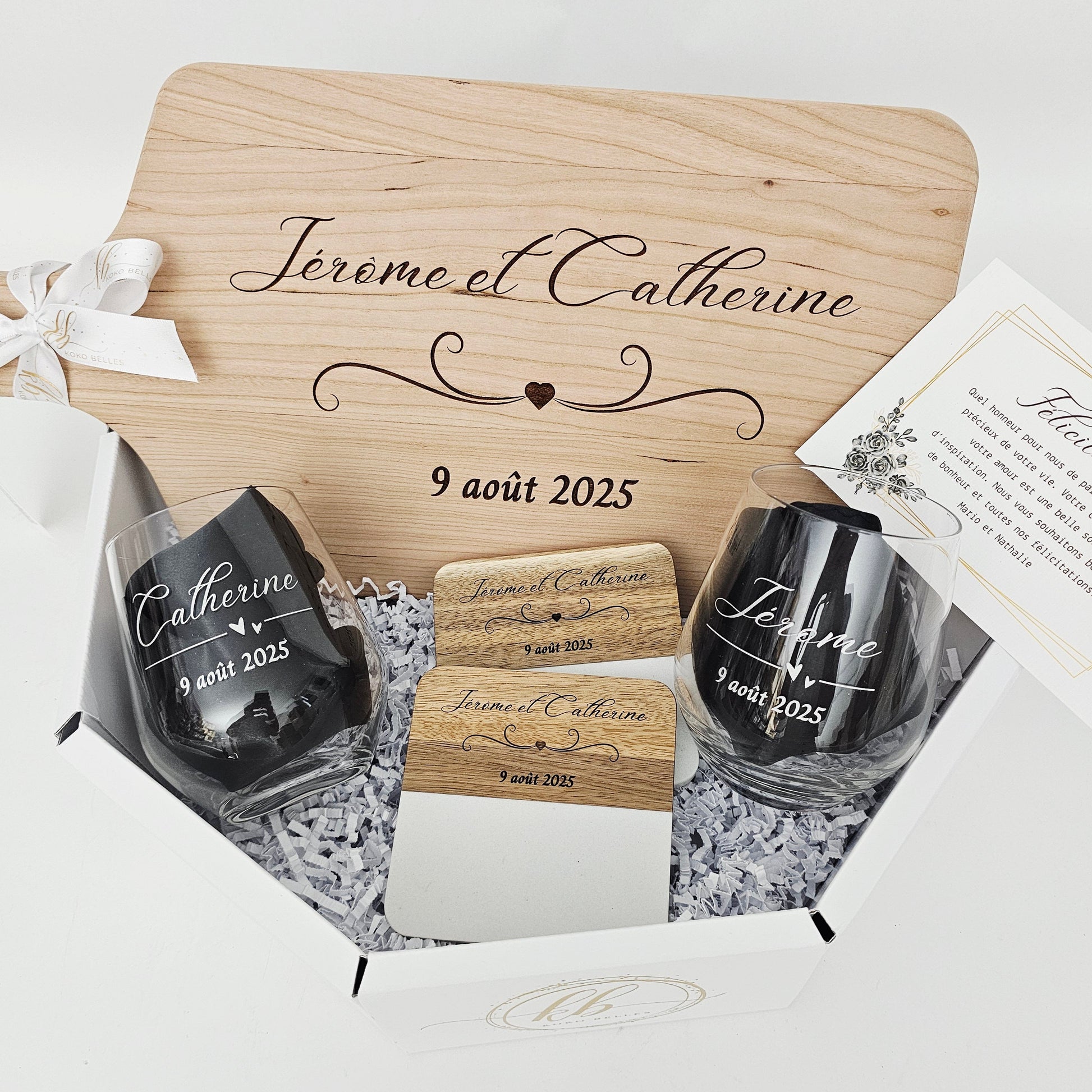 Looking for the ideal gift for a couple, a new homeowner, or a gracious host? Our personalized gift package is a perfect choice! It includes a custom-engraved cutting board, two elegantly personalized stemless wine glasses, and a set of personalized coasters to complete the ensemble. For an extra touch of celebratory flair, add a bottle of their favorite wine and take this already wonderful gift to an extraordinary level.